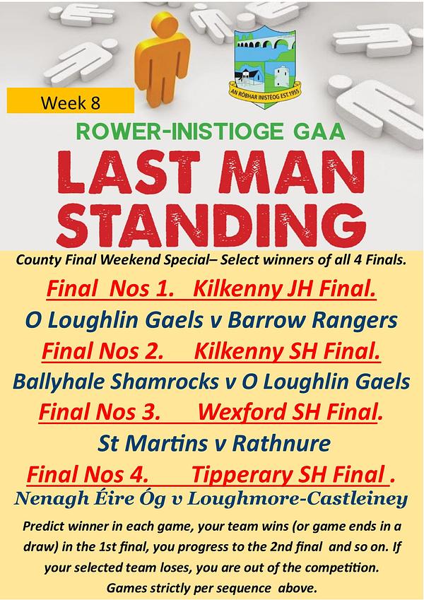 Entrants are now in for the 4 County Finals this weekend in the Last Man Standing Competition. O Loughlins Juniors are strong favourities in the Junior Final with 81% of the entrants predicting they will overcome Barrow Rangers, while in the Senior decider, Ballyhale Shamrocks are overwhelming favorities with 87% of the entants predicting they will defeat O Loughlins. In the Wexford and Tipperary County Finals, St. Martins and Loughmore Castleiney are favoured to retain their current County titles.