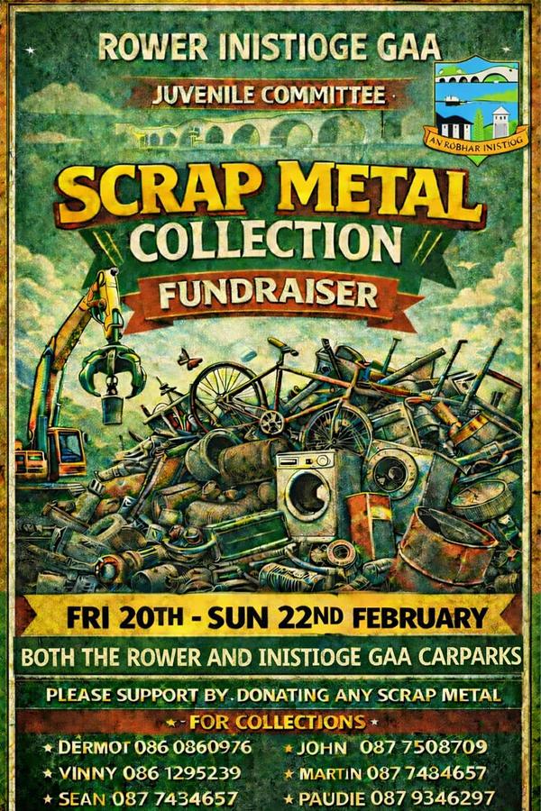 Gentle reminder that our Juvenile Committee have started collecting scrap metal for their fundraiser. All scrap metal can be dropped at the Rower and Inistioge GAA ground car parks on the weekend of 20th - 22nd February. Alternatively, contact any of those named on the poster to arrange collection.
