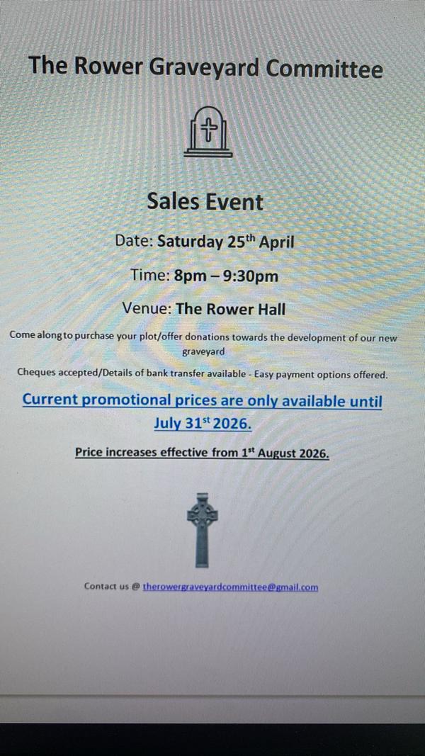 The Rower Graveyard Committee are having a second sales night, on Saturday 25th April from 8-9:30pm in The Rower Hall.